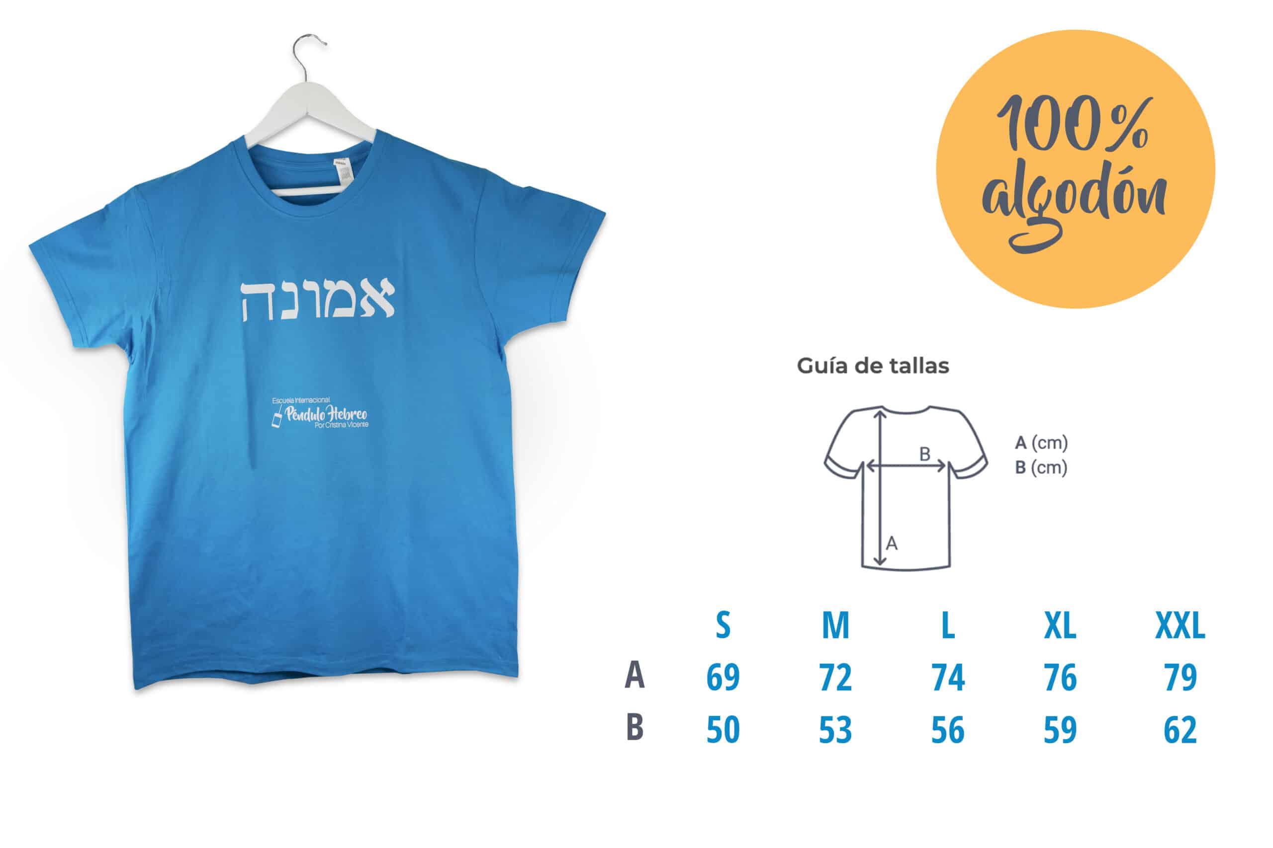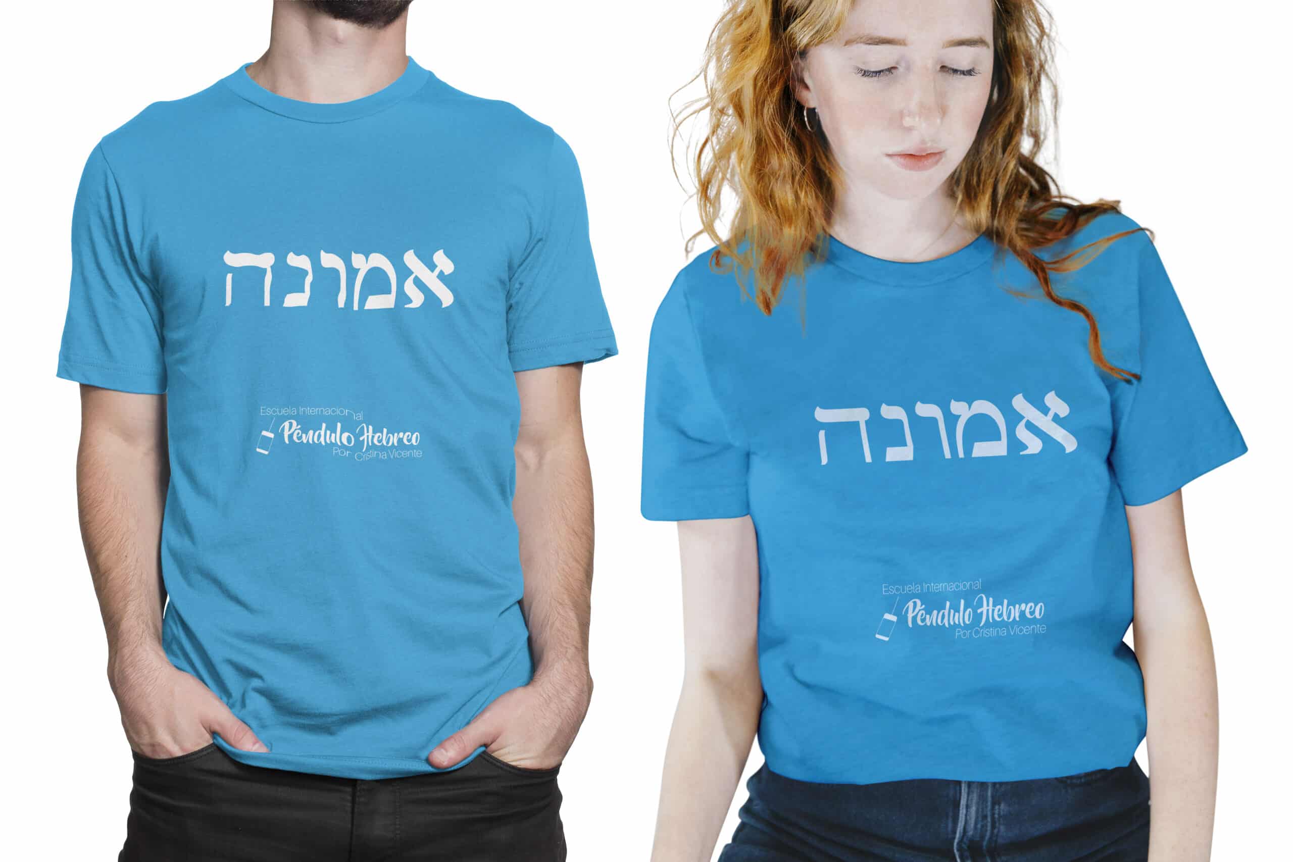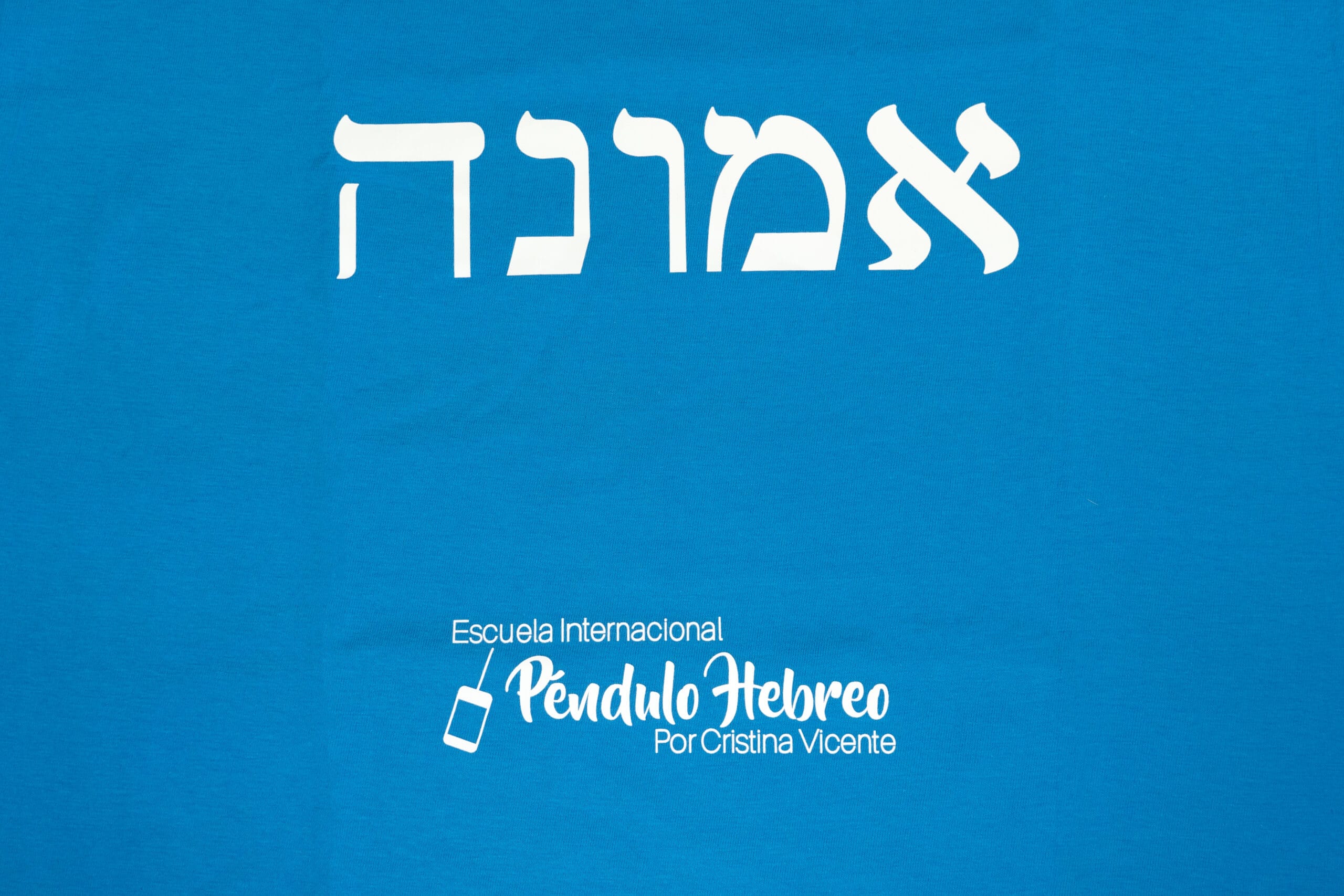 Camiseta azul de la Escuela Internacional de Péndulo Hebreo con la palabra en hebreo “Fe”.